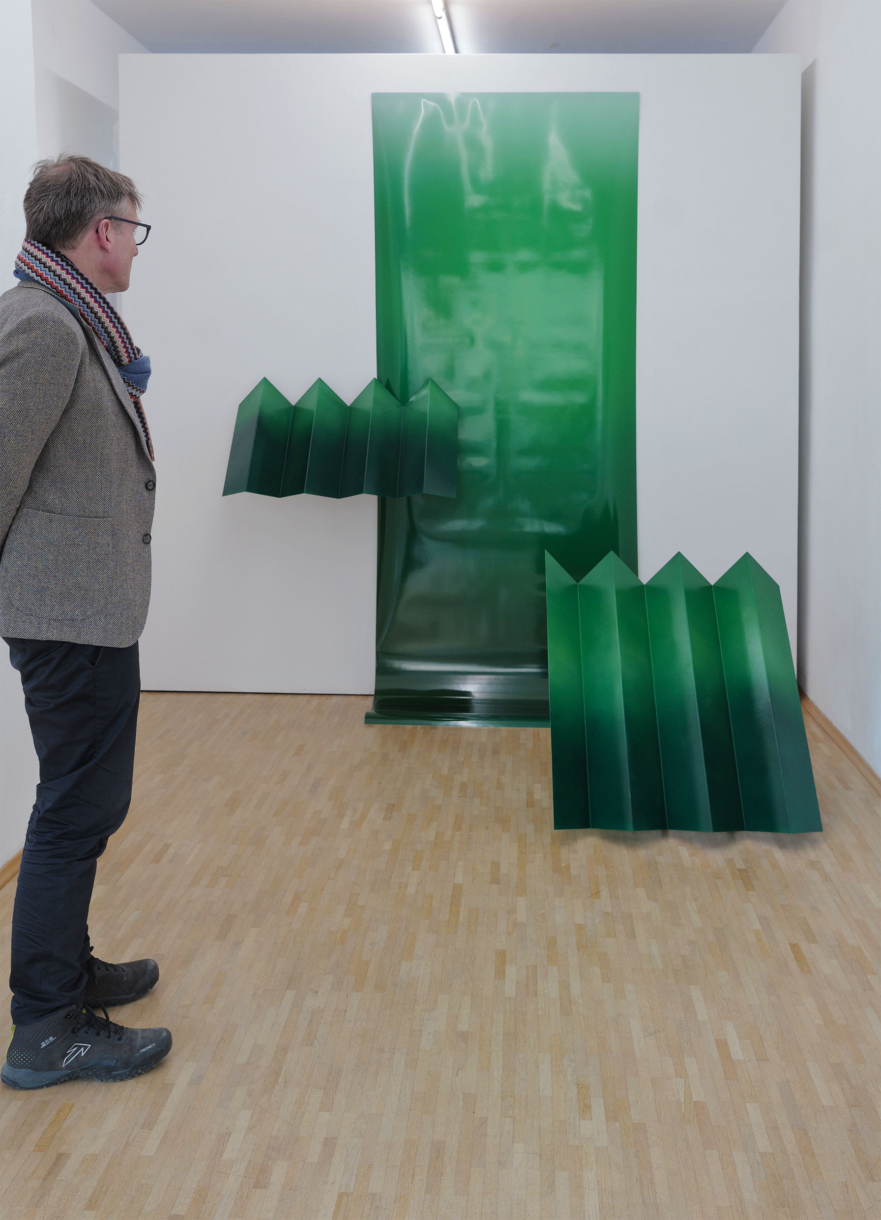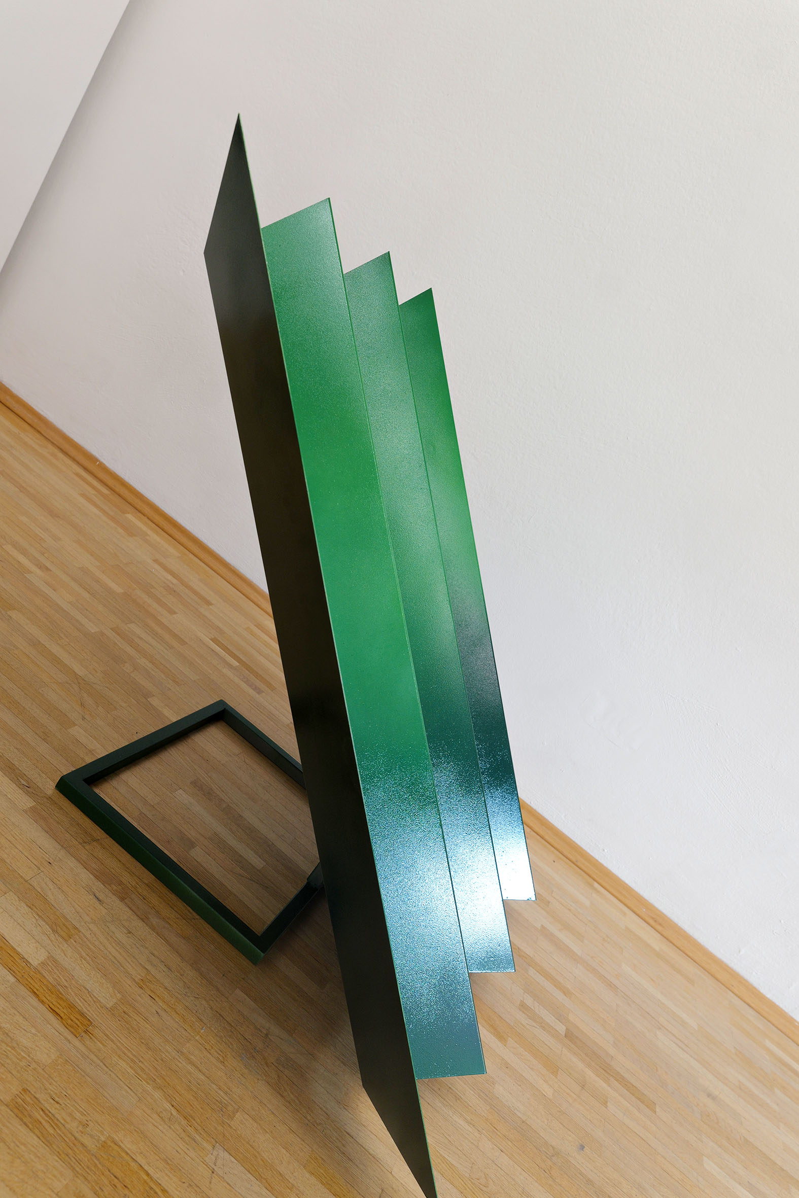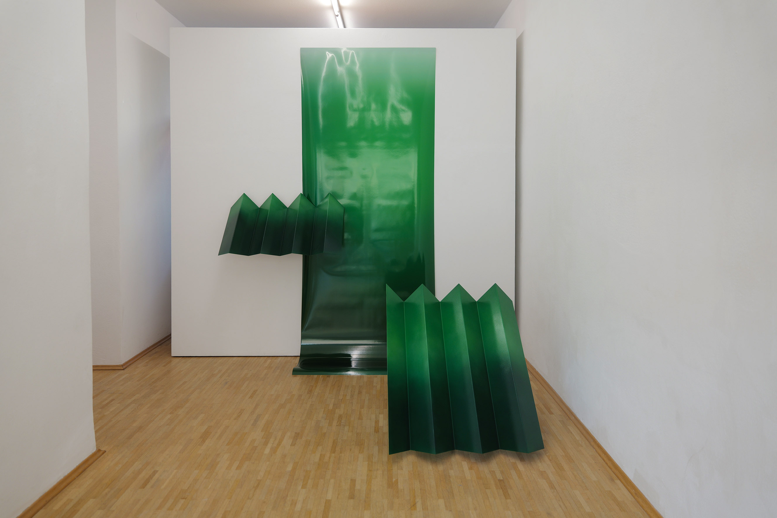 Scene from above (Forest) ist inspiriert von einer aus der Vogelperspektive aufgenommenen Landschaftsfotografie, die den Amazonas-Dschungel zeigt, durchbrochen von einzelnen Wellblechdächern. Diese Aufnahme bildet den Ausgangspunkt der Installation, wird jedoch nicht dokumentarisch wiedergegeben, sondern stark abstrahiert. Im Zentrum der Arbeit stehen Farbe und Form, die sich zu einer räumlichen Komposition verdichten. Die Installation überträgt die fotografische Draufsicht in eine körperlich erfahrbare Struktur. Durch die Abstraktion der Landschaft lösen sich konkrete Orte zugunsten einer formalen Auseinandersetzung auf. Die skulpturalen Elemente erzeugen eine reliefartige Topografie, die zwischen Bild und Raum vermittelt.