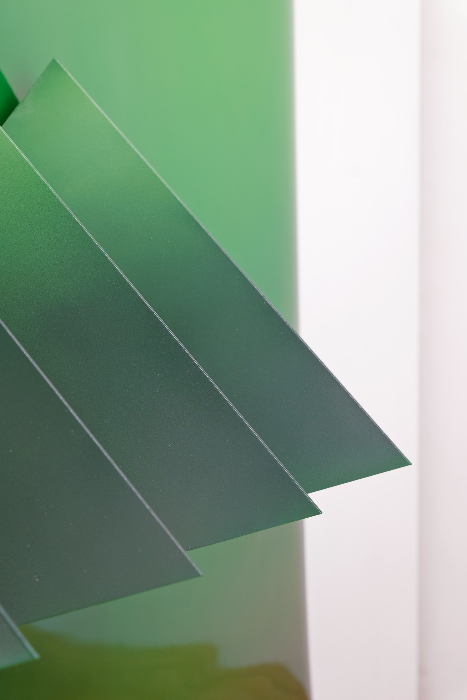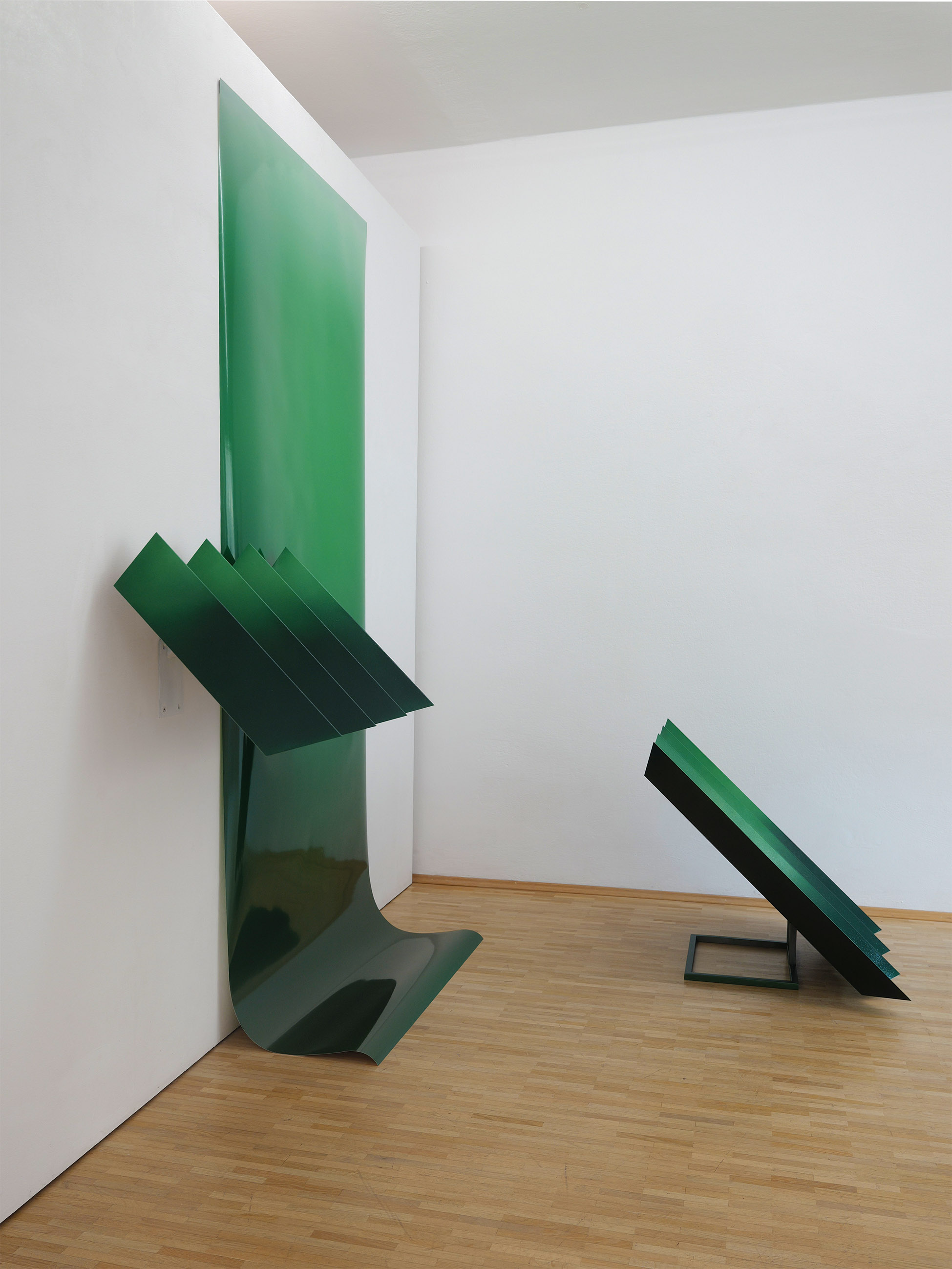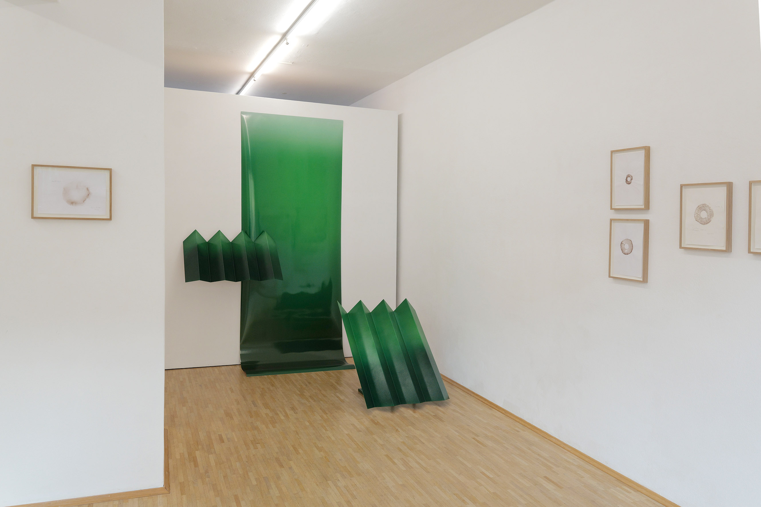 Scene from above (Forest) is inspired by an aerial photograph showing the Amazon rainforest, interrupted by scattered corrugated metal roofs. This image serves as the starting point for the installation, but it is not reproduced documentarily; rather, it is strongly abstracted. At the heart of the work are color and form, condensed into a spatial composition. The installation translates the photographic top-down view into a physically tangible structure. Through the abstraction of the landscape, specific locations dissolve in favor of a formal exploration. The sculptural elements create a relief-like topography that mediates between image and space.