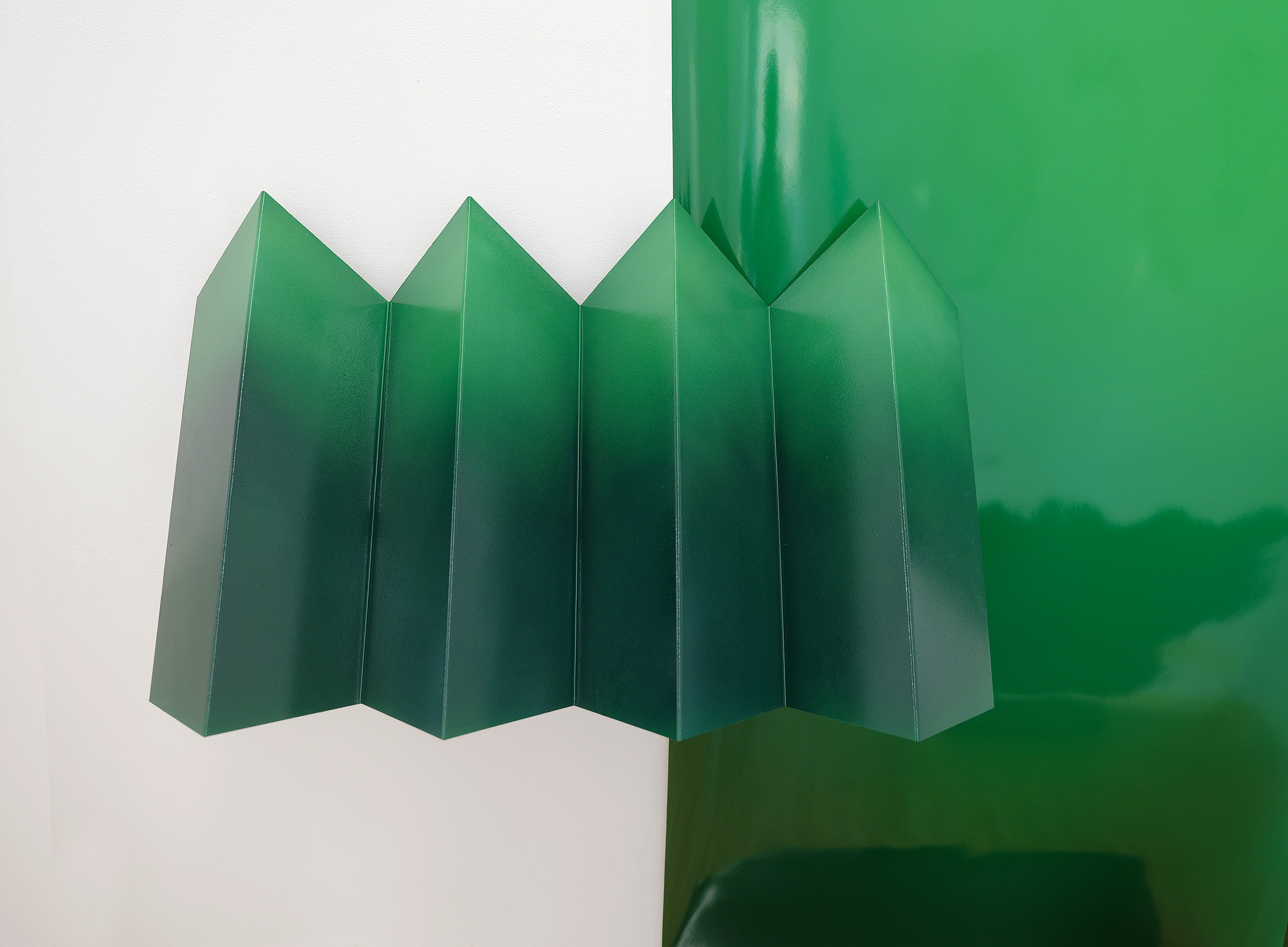 Installation, photographic print, folded stainless steel, lacquer