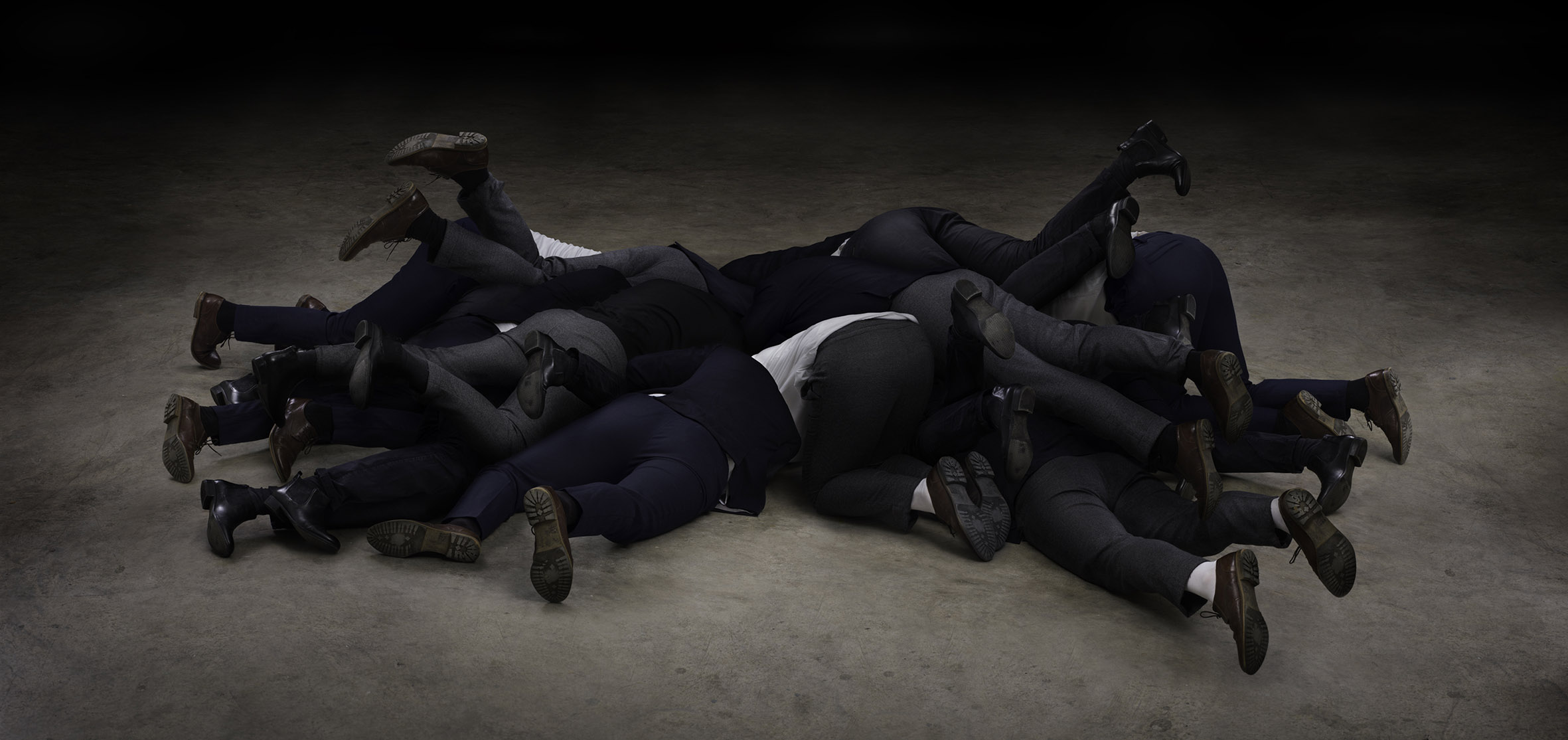 Tina Hage verkörpert jede im Bild dargestellte Person in einzelnen Selbstporträts, die sie im Atelier macht, und in einem zweiten Schritt am Computer zum Gesamtbild collagiert. Um eine eingenommene Pose fotografisch festzuhalten, muss sie für einen Moment still verharren, paradoxerweise sind aber die Szenen, die sie nachstellt von größter Aktion und Bewegung geprägt. In der im Originalfoto dargestellten reellen Szene haben sich Männer unter Einsatz des ganzen Körpers übereinandergeworfen, das Foto friert diese Aktion ein, vermittelt sie aber. Dieses Spannungsverhältnis von Bewegtheit versus Starre ist in den Arbeiten wahrnehmbar. Obwohl der Betrachter Körper in wilden, Bewegung suggerierenden Posen sieht, strahlen die Motive auch eine nicht leicht zu fassende Stille aus.